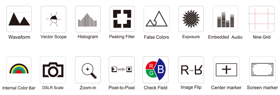 Five assignable shortcut keys: F1, F2, F3, F4 and F5 for fast access to the functions you needs, Waveform, Vectorscope, Histogram, Peaking, False Color and other functions by mean of push button.