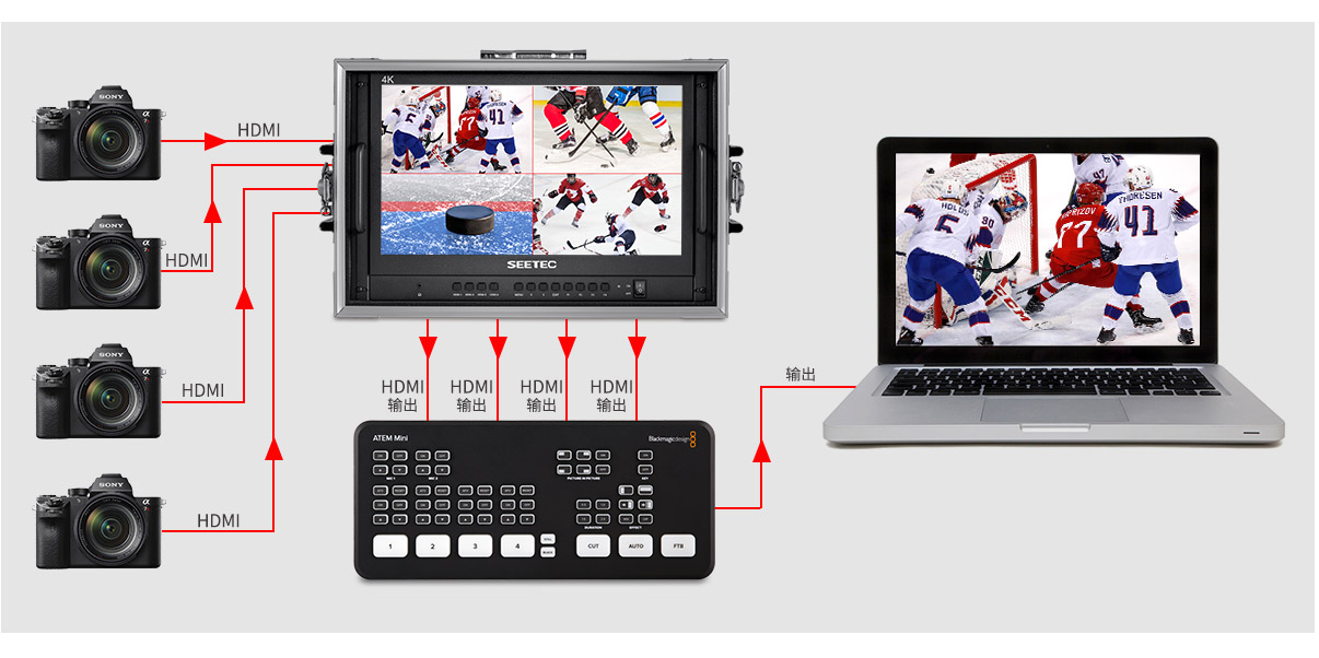 SEETEC ATEM156-CO根据前期拍摄和后期制作的实际需要,设定了专业的监看功能,帮您提高拍摄的工作效率。配备四个4K HDMI输入,支持四画面、双画面、单画面监视功能,让您在任何位置都可以进行多机位监看!包含各种聚焦检查功能,例如峰值对焦、伪色彩、点对点,可帮助获得清晰的图像。包含取景功能,例如中心标记、安全标记、网格标记,用来防止在直播过程中切割屏幕,在直播过程中为其他功能留出正确的空间。还包含了图像放大、单色显示、图像冻结、色温调整等功能。