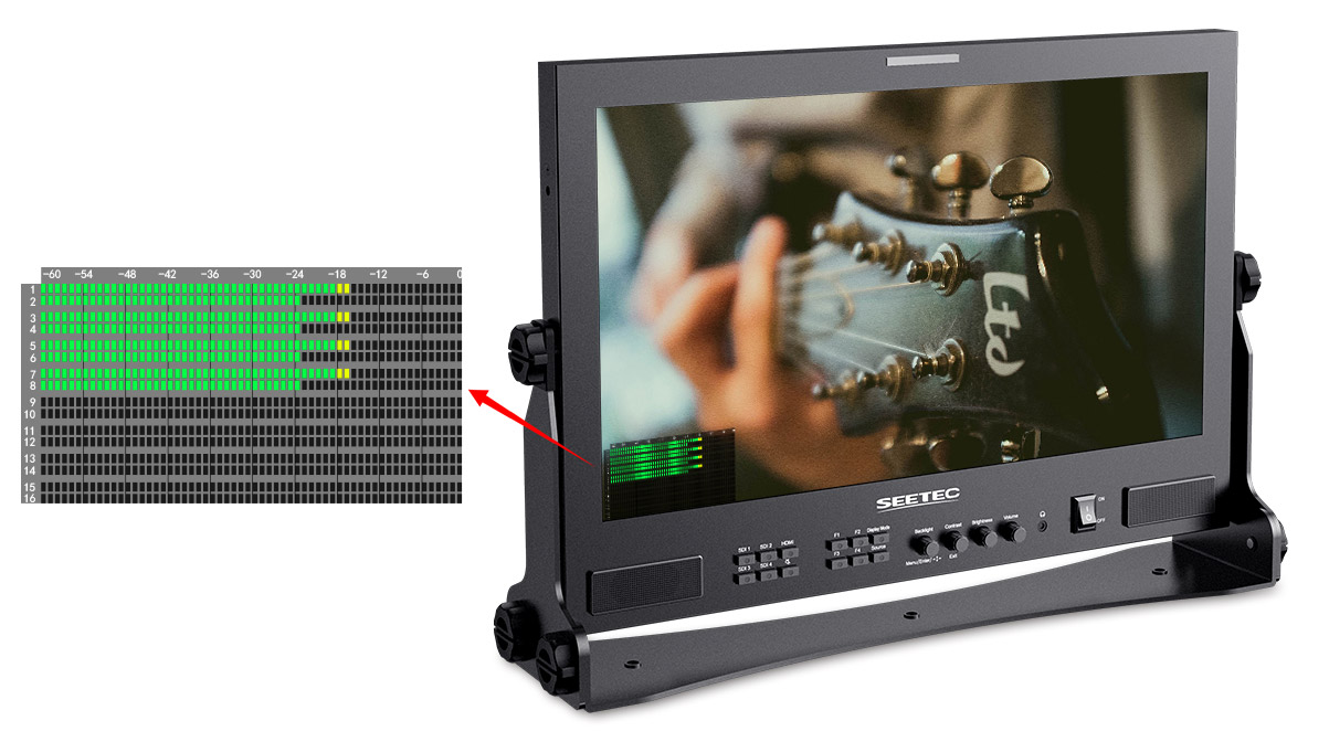 监视器可以解嵌来自SDI和HDMI的音频, 您可任选2路音频通过3.5mm耳机口输出。 在SDI音频下,支持最大16路音柱显示,在HDMI音频下,仅支持2路音柱显示。