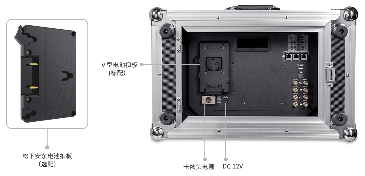 监视器配备DC 12V/2A~3A电源,卡侬头电源接口和索尼V型电池扣板(适用锂电池)可供选择。