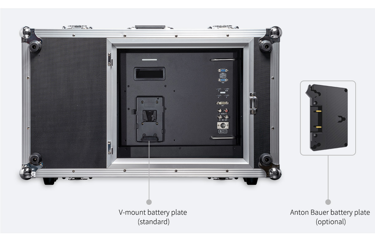 The monitor an be powered by DC adapter or lithium battery. For power adapter, you can connect XLR power connector; for battery, you can mount it on V-mount battery plate (standard) or Anton Bauer battery plate (optional).